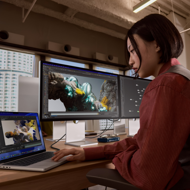 Даже такого замечательного в техническом плане экрана, как в MacBook Pro может быть недостаточно для комфортной работы с профессиональными приложениями, когда нужно больше пространства. Но ко всем MacBook Pro с процессорами M5 Pro можно подключить до трёх дисплеев сразу, которые будут работать одновременно со встроенным экраном. Причём не просто каких-то дисплеев, а с разрешением до 6K и частотой 60 Гц или 4K и частотой до 144 Гц. Максимальное поддерживаемое разрешение для внешнего экрана составляет 8K при частоте 60 Гц (поддерживается частота до 120 Гц для 5K).