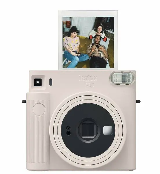 Фотокамера моментальной печати FujiFilm Instax Square SQ1 представлена в компактном белом корпусе с наручным ремешком, позволяющим избежать случайного падения устройства. Прибор оснащен видоискателем и вспышкой, действующей до 2.2 м. Время выдержки составляет 1/400-1/2 секунд.