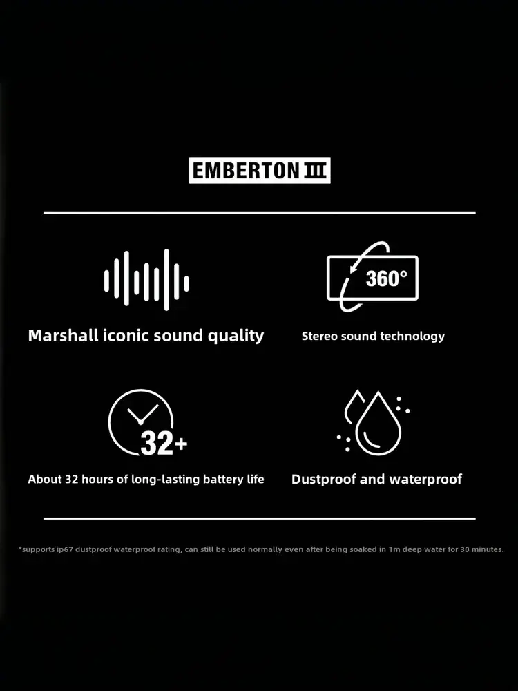 Marshall Emberton III обеспечивает 32 часа портативной работы от одного заряда. Компактный размер, прочная конструкция и длительное время воспроизведения делают ее идеальным вариантом для того, чтобы взять с собой.