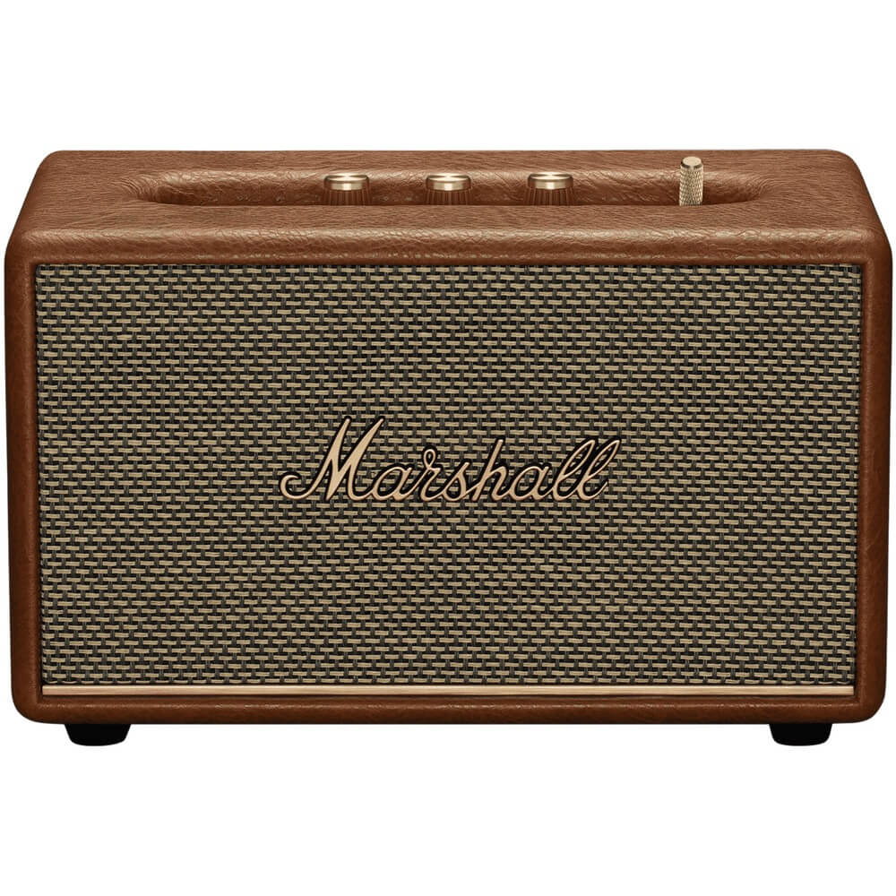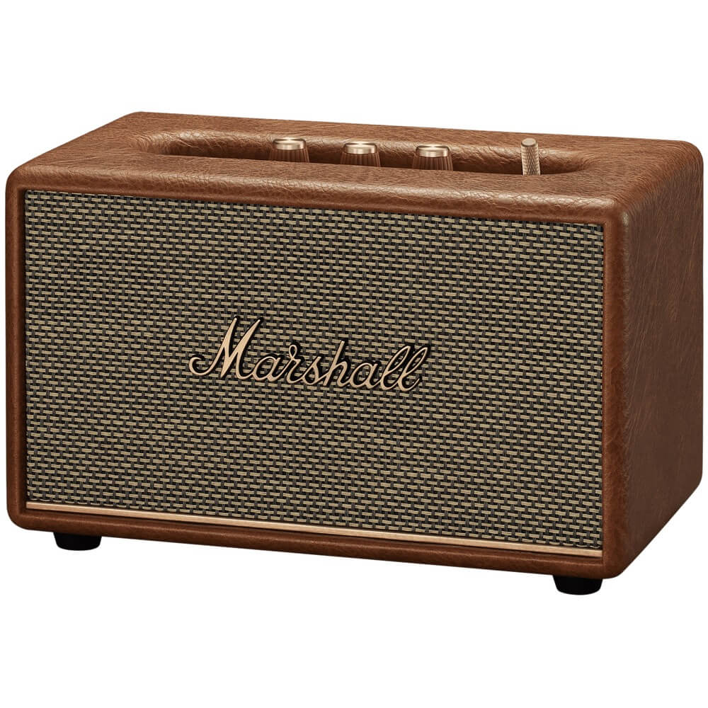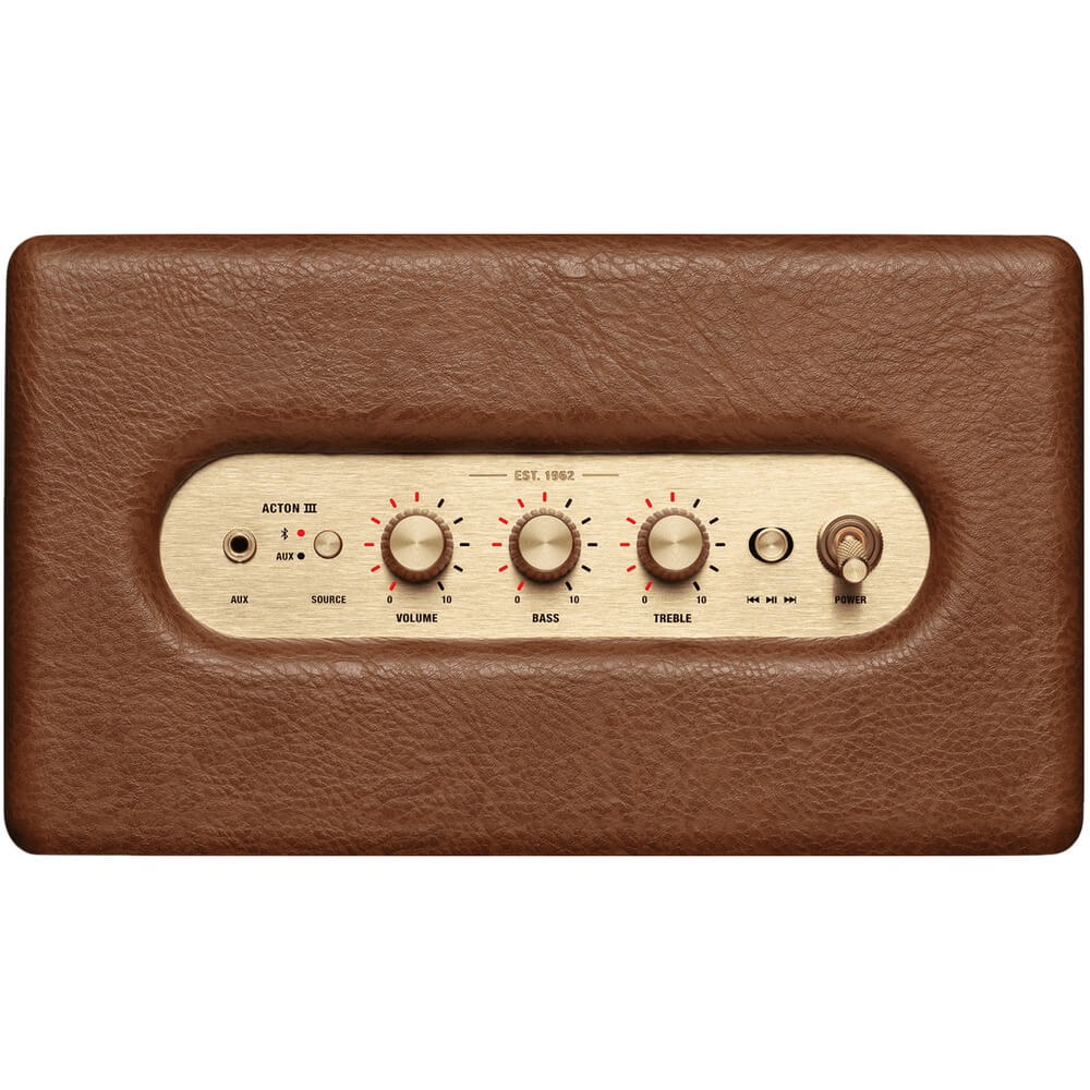 Аналоговые ручки управления звуком, басом и высокими частотами, расположенные на панели с фактурой дерева и угловатый корпус, покрытый экокожей, отлично передают ретро стиль колонки. Фирменный шрифт Marshall и латунные переключатели подчеркивают дизайн, отсылая к эпохе рок-н-ролла.
