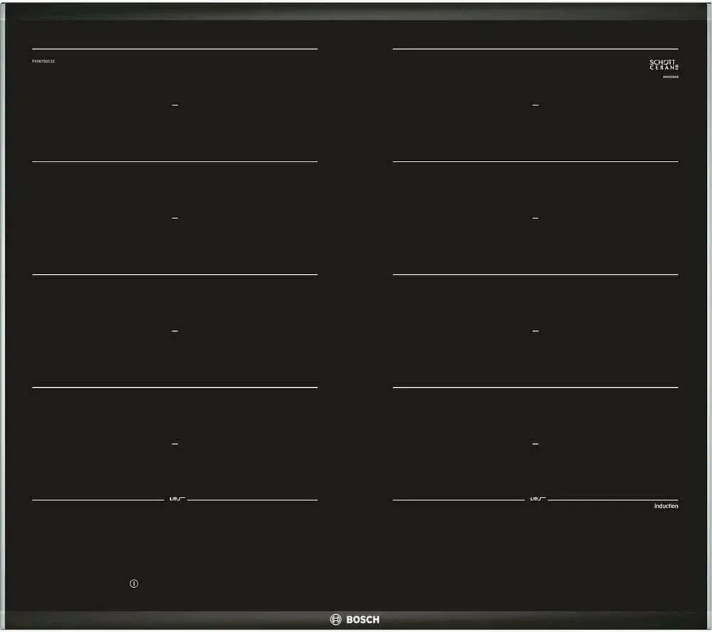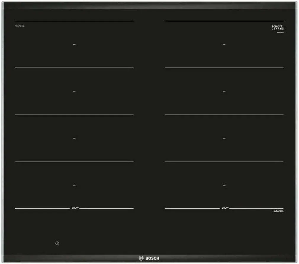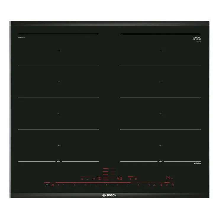 Варочная панель Bosch PXX675DC1E из линейки FlexInduction позволяет объединять четыре конфорки в две независимые или одну большую зону нагрева. Автоматически активируются только те индукторы, над которыми находится посуда, что минимизрует расход электроэнергии. Благодаря технологии Home Connect возможна удаленная диагностика.